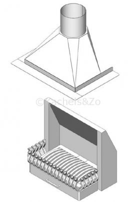 Komplete panorama openhaard bestaande uit een rookkap, een vuurplaat, een achterwand en een vuurkorf