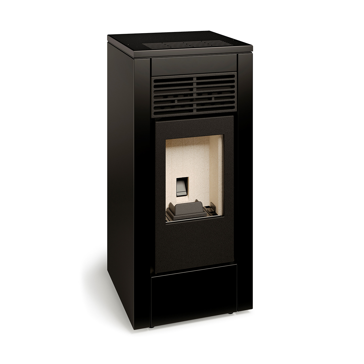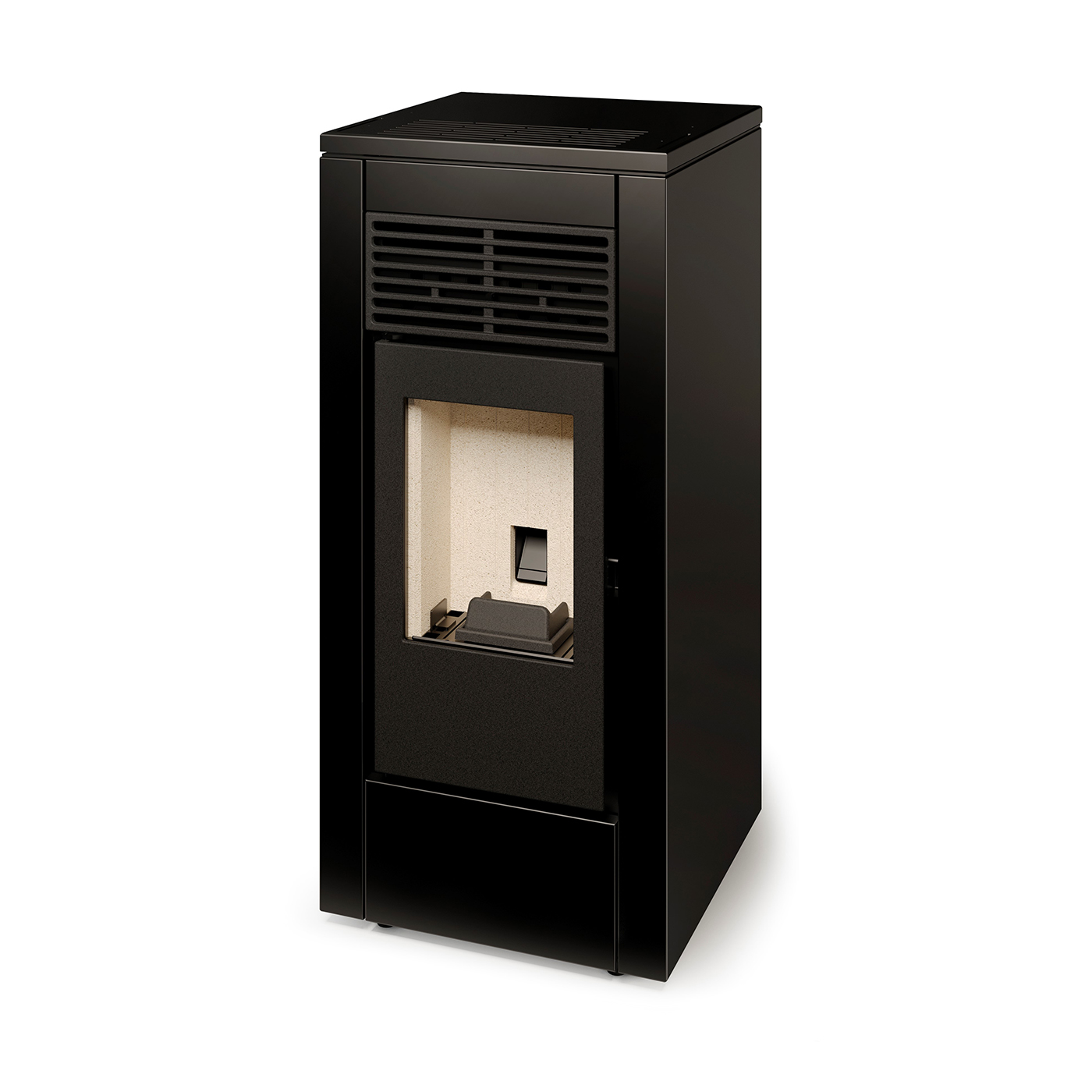 Dankzij de glazen deur geniet u van een prachtig zicht op het vlammenspel, terwijl het bovenste schuifdeksel het bijvullen van pellets eenvoudig en comfortabel maakt.