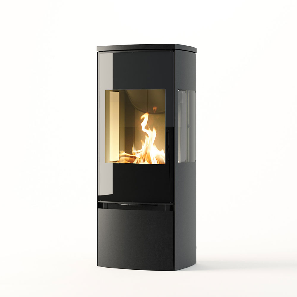 De volledig glazen deur aan de voorzijde geeft een helder zicht op het knapperende vuur, terwijl de geïntegreerde handgreep bijdraagt aan de strakke vormgeving en moderne uitstraling van de kachel.