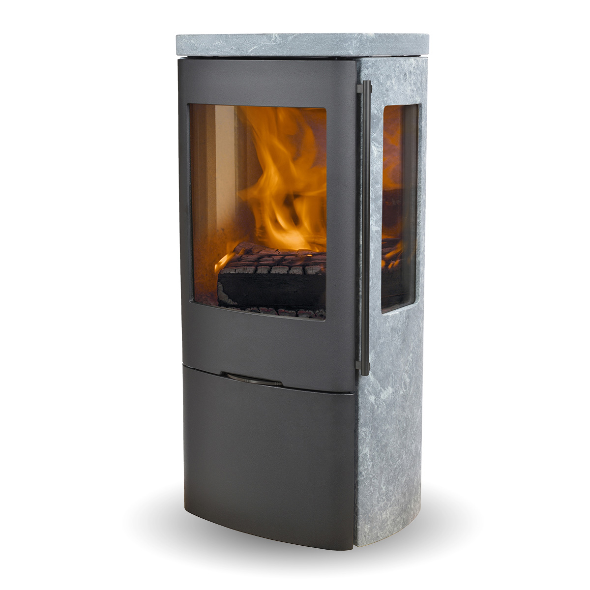 Deze houtkachel is verkrijgbaar in vier uitvoeringen, met of zonder zijruiten. Bij modellen met zijruiten geniet je vanaf drie zijden van een prachtig zicht op het knapperende vuur.