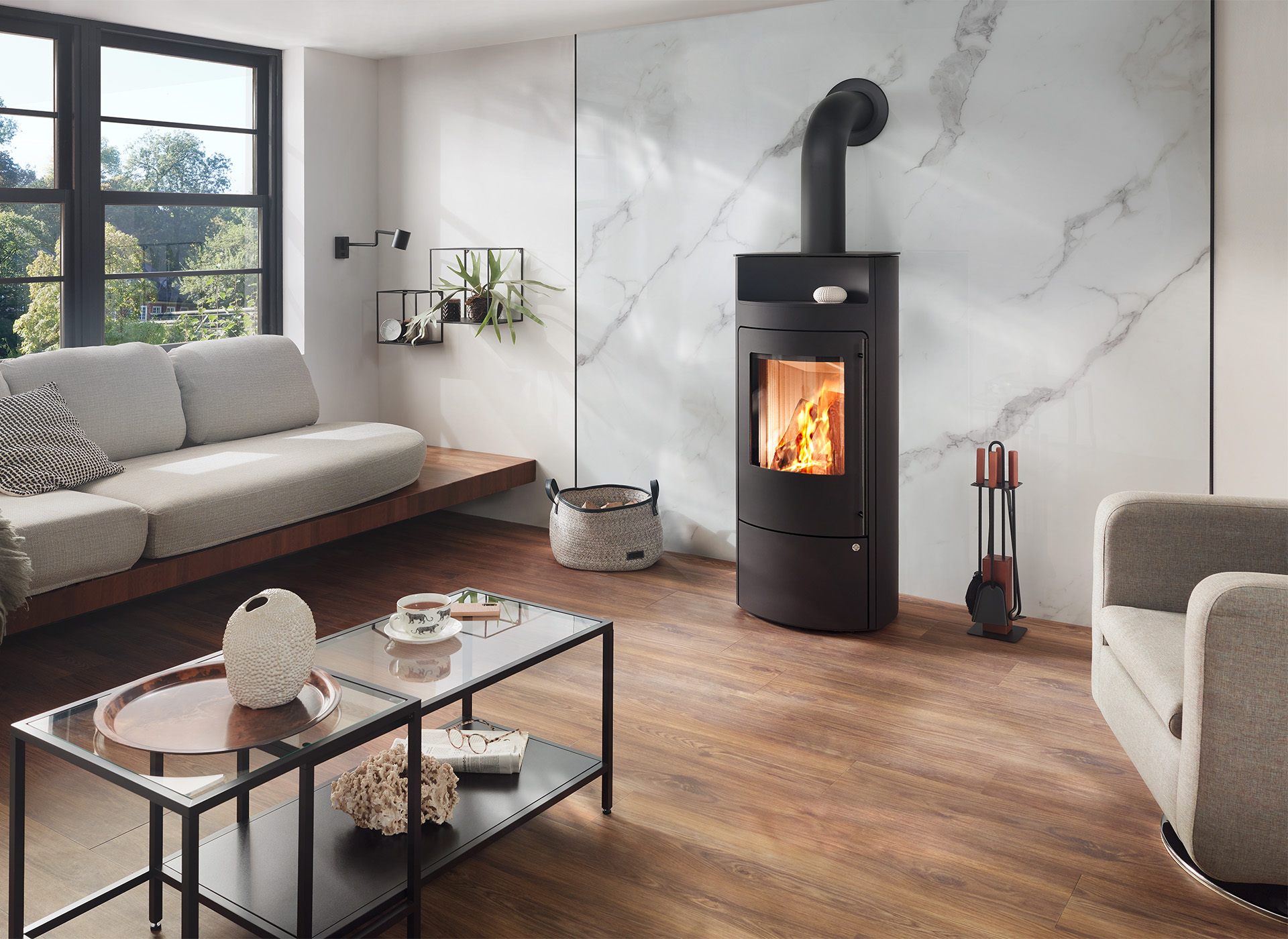 Dankzij het slanke en ranke ontwerp voegt deze houtkachel hoogte en elegantie toe aan uw woonkamer. Zo verandert uw woonruimte in een oase van rust en ontspanning.