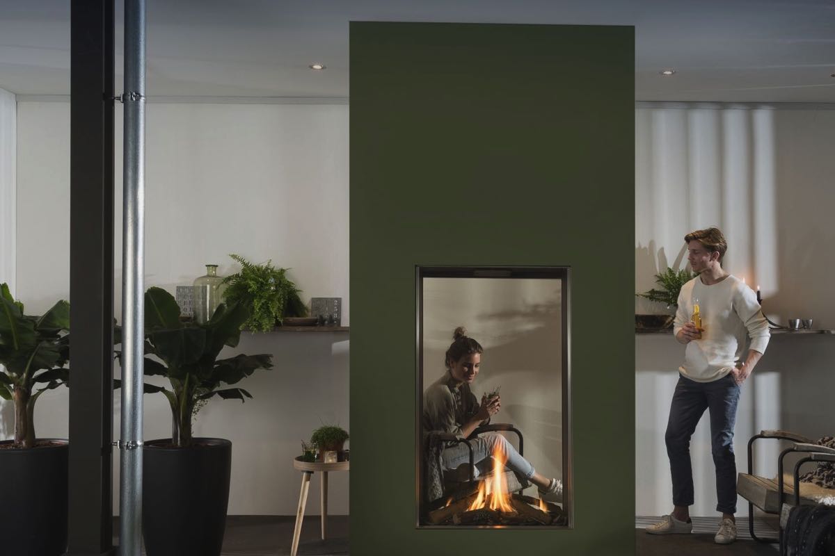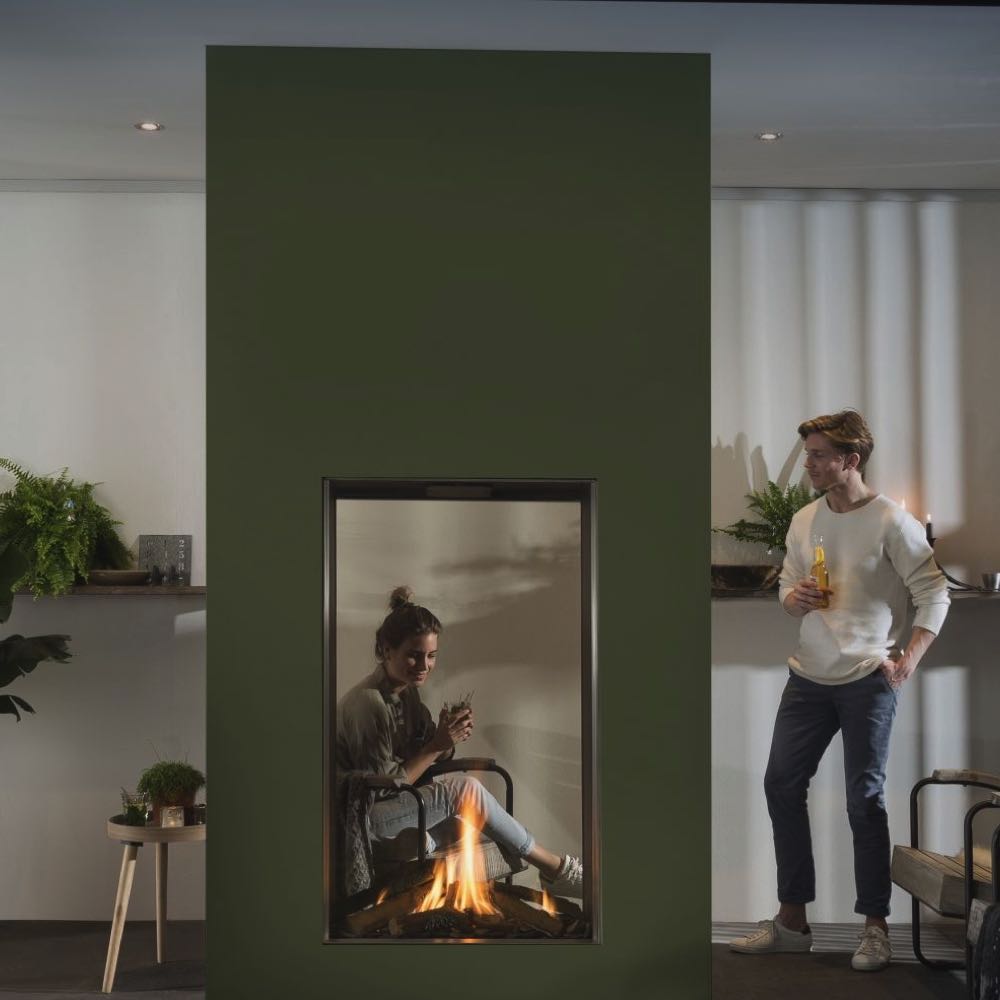 Met deze doorkijk gashaard van Element4 zijn twee ruimtes echt goed bij elkaar te betrekken en geeft het een ruimtelijk en hoog effect! Met de Real Flame burner bent u verzekerd van een extreem realistisch vuurbeeld. In de combinatie met de natuurgetrouwe gekloofde houtstammen ontstaat er een schitterend houtvuur. De haard kan worden uitgerust met een standaard houtset of een donkere houtset, zo is de haard aan te passen naar ieder interieur.