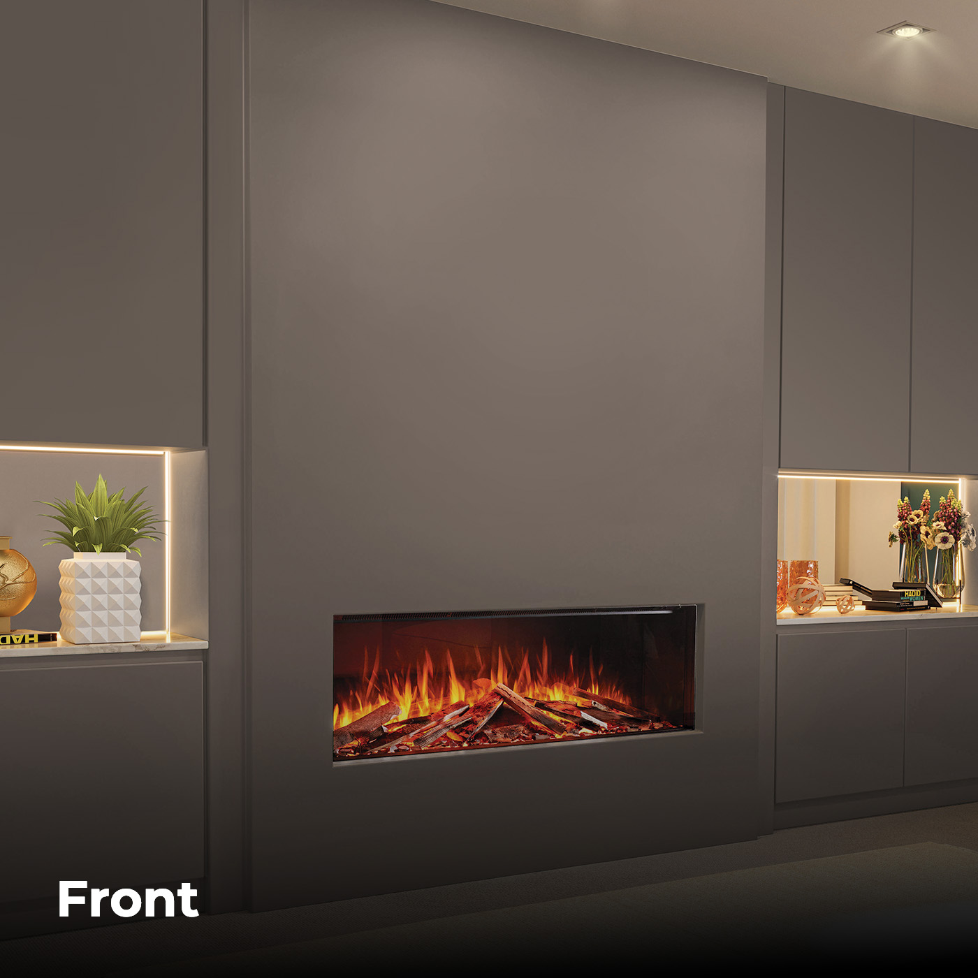 - Veelzijdig Ontwerp: Pas je haard aan aan je voorkeuren met drie verschillende installatieopties: frontaal, tweezijdig of driezijdig. Ongeacht je ruimte, integreert onze haard naadloos in je interieur en voegt een vleugje elegantie en warmte toe.