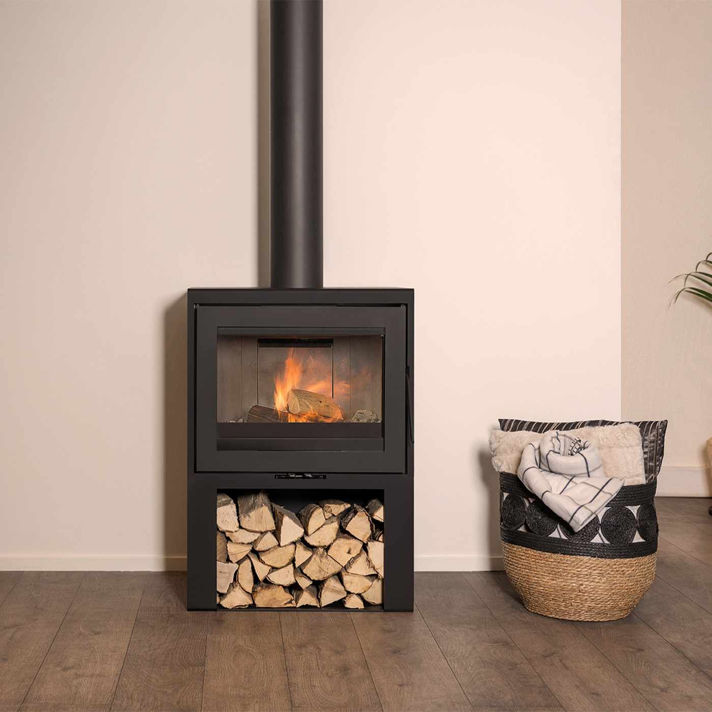 De houtopslag onder de kachel zorgt niet alleen voor extra gemak, maar versterkt ook het robuuste, luxe karakter van deze design houtkachel.