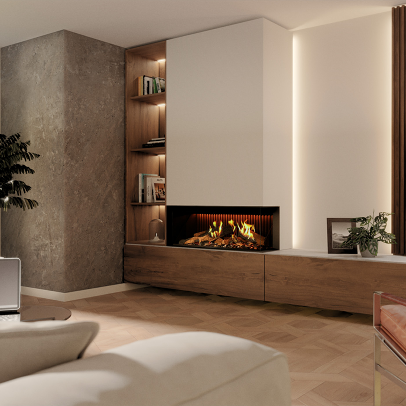De nieuwe elektrische haarden Virtuo Evolve zijn beschikbaar! Deze DRU haarden zijn nog groener en nog realistischer. De elektrische haarden zijn zo ontwikkeld dat het vuur bijna niet te onderscheiden is van echt vuur. De Zo ervaar je een volledige vuurbeleving in 3D, maar zonder de uitstoot. Deze DRU Virtuo 100/2 Evolve hoekhaard is zowel in een linkse als rechtse opstelling verkrijgbaar.