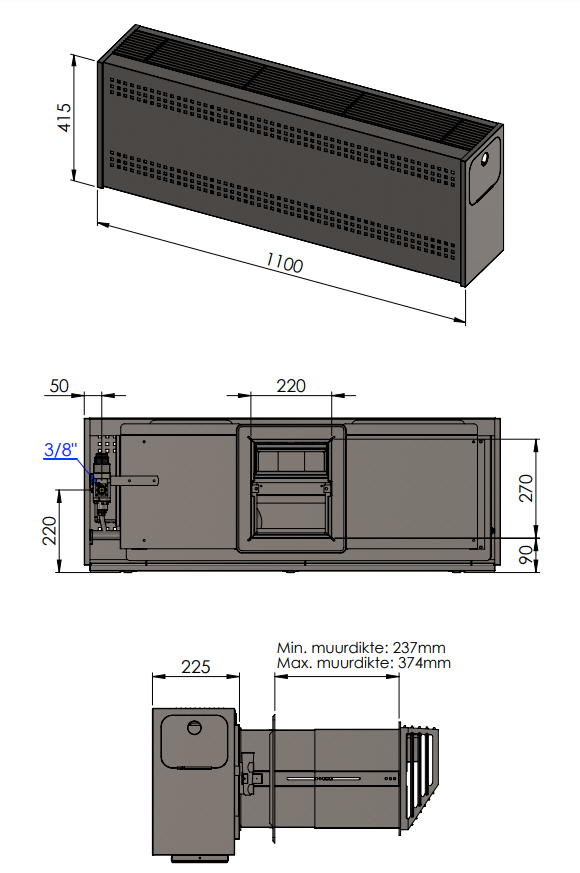 Let op: bij de radiatoren van de P-serie met gesloten verbranding wordt altijd een muurdoorvoer gebruikt. Deze doorvoer gaat rechtstreeks horizontaal door de buitenmuur, waarbij een concentrische buis met een diameter van 100/150 mm niet mogelijk is.