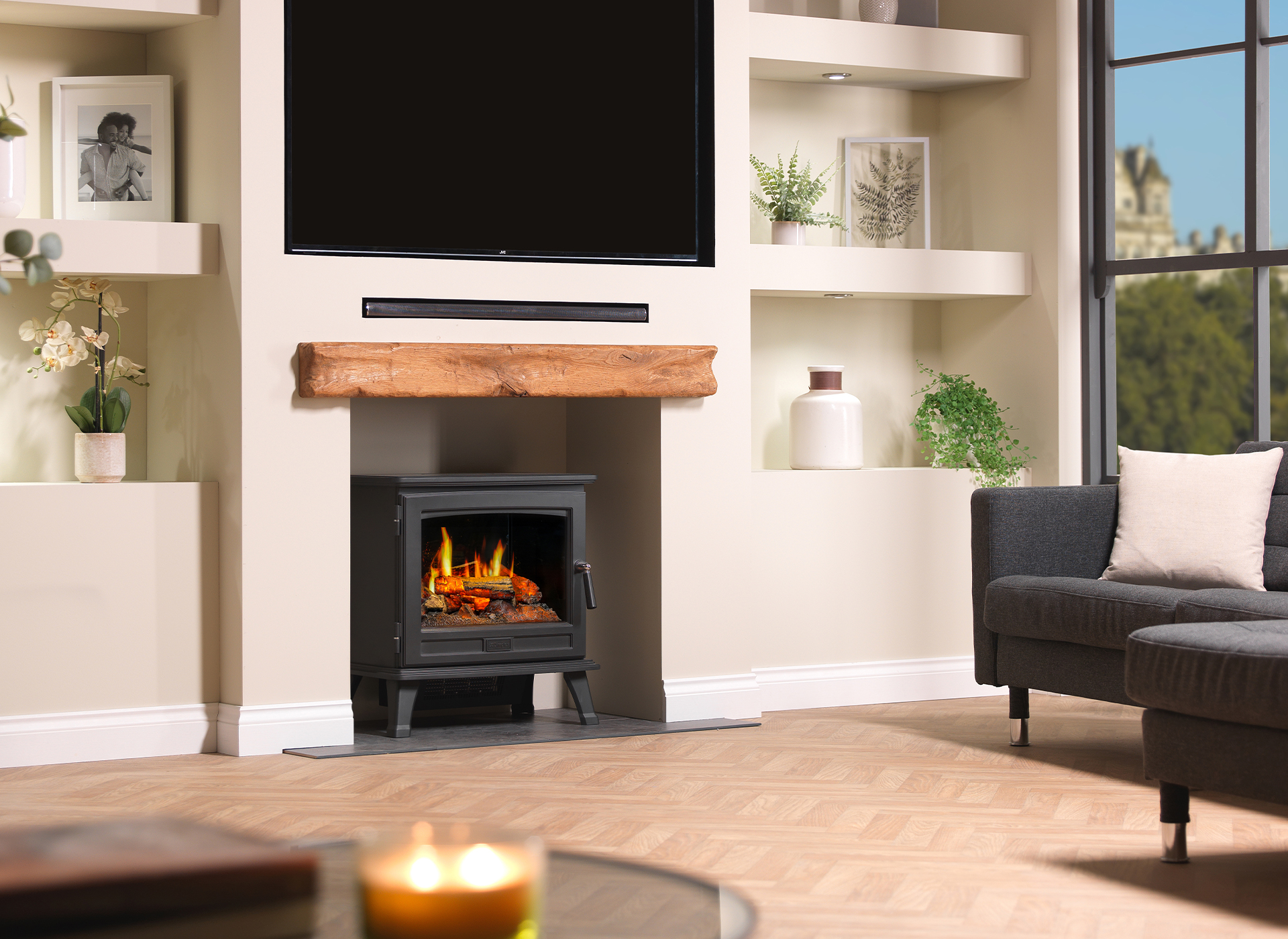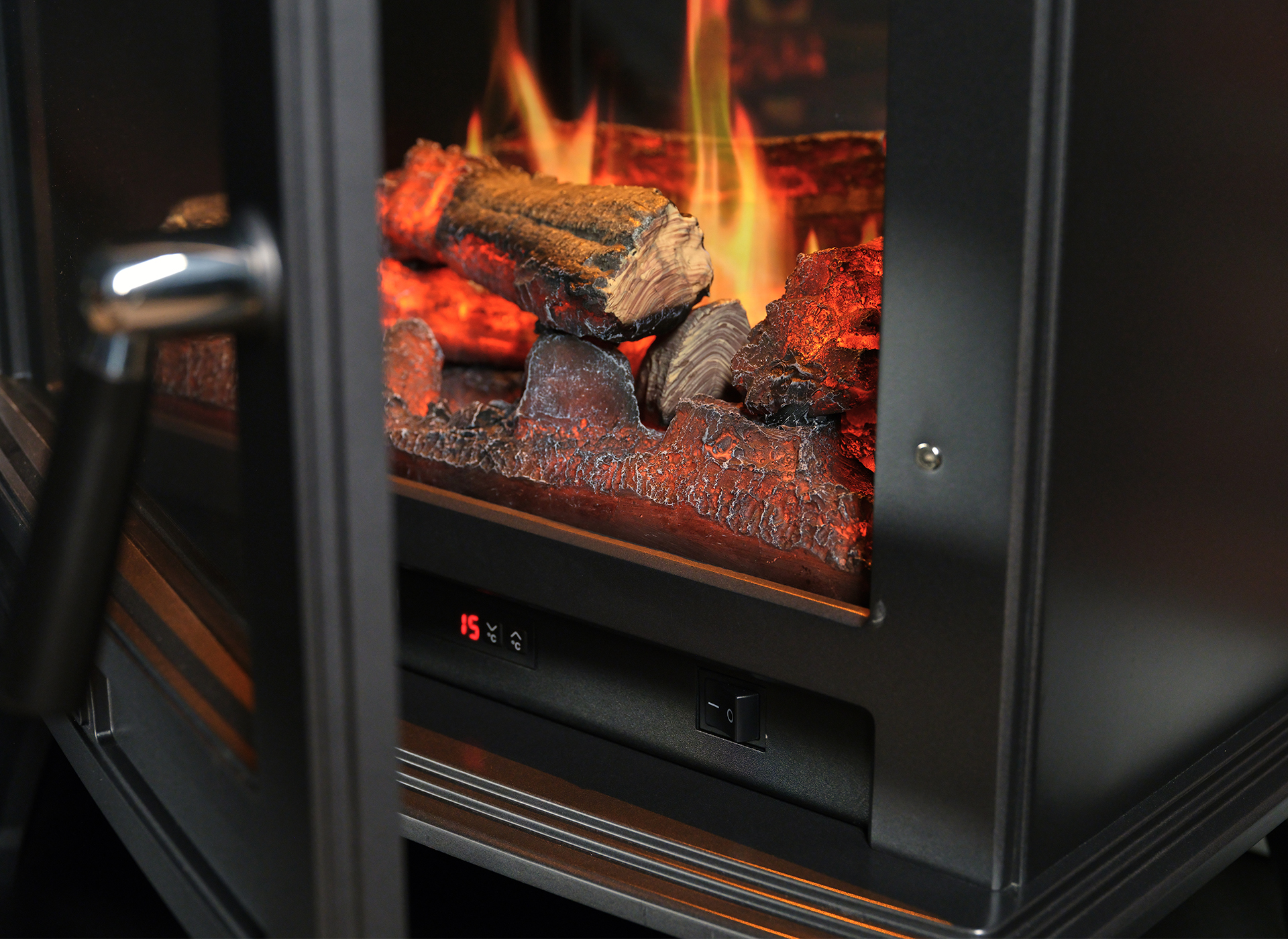 Heldere beglazing en geïntegreerde bovenverlichting versterken het vuurbeeld, zelfs bij weinig licht. De openklapbare deur en realistische houtdecoratie maken de beleving compleet. Met één druk op de knop regelt u de vlammen, het geluid en de temperatuur, via het display of de afstandsbediening.