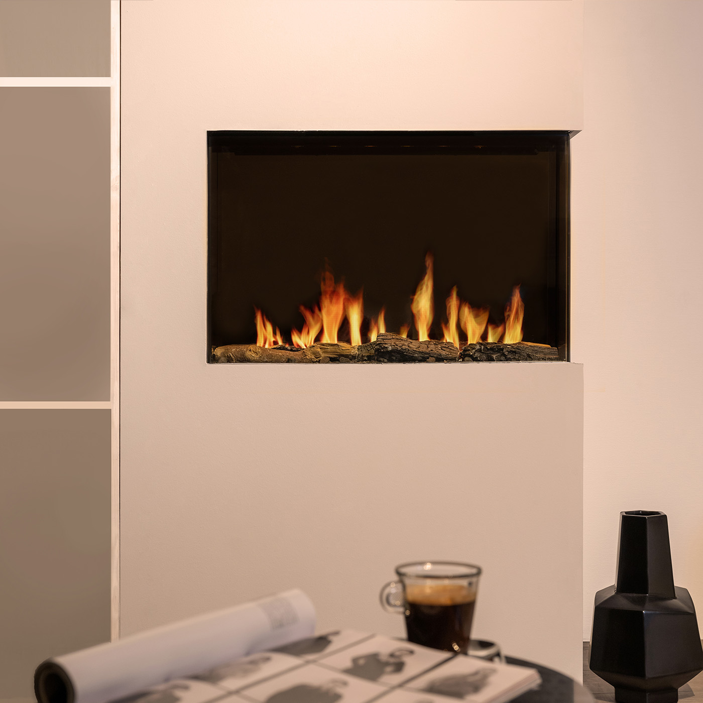 De haard geeft naast sfeer ook warmte af tot 2 kW. Met de Wanders Multi 30'' creëer je in een handomdraai een warme, knusse sfeer in huis, met het comfort van moderne technologie.