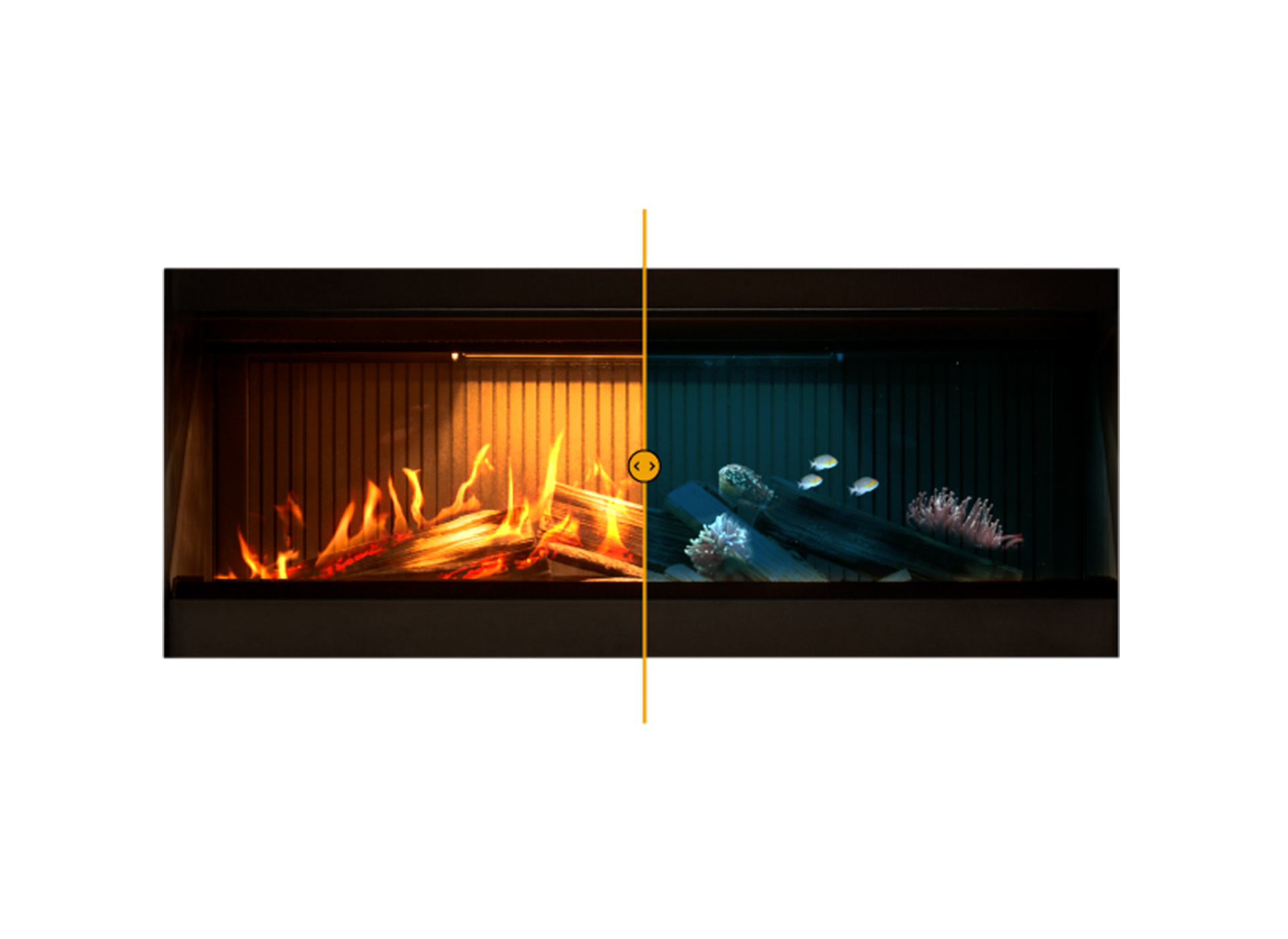 Naast het indrukwekkende vlamscenario beschikt de Janus serie over een unieke aquarium-optie. Met een druk op de knop verandert u het vuurbeeld in een rustgevend decoratief beeld van koraal met rondzwemmende vissen. Deze veelzijdigheid maakt de haard niet alleen een bron van warmte, maar ook een kunstwerk voor uw interieur.